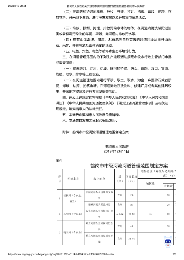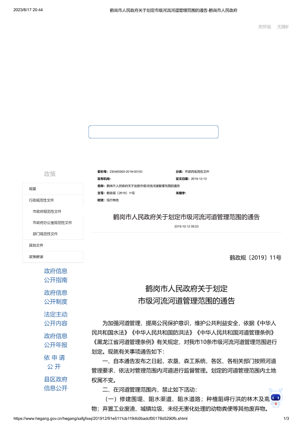 鹤岗市人民政府关于划定市级河流河道管理范围的通告(鹤政规[2019]11号).pdf