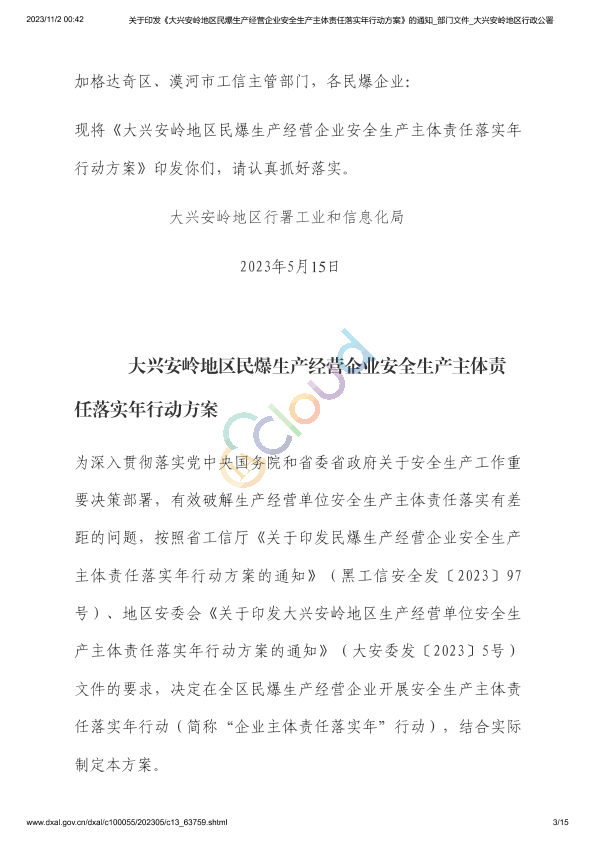 关于印发《大兴安岭地区民爆生产经营企业安全生产主体责任落实年行动方案》的通知(大工信发[2023]15号).pdf