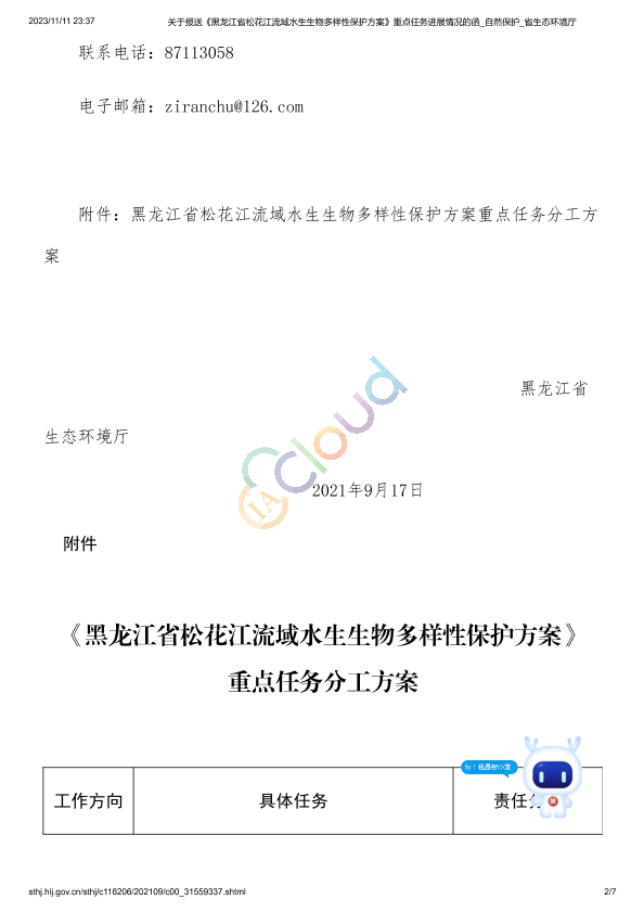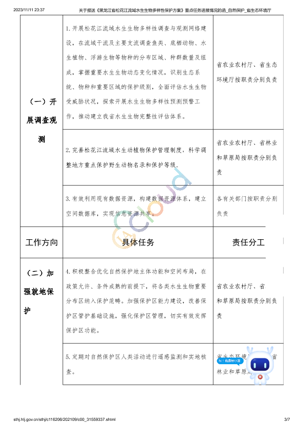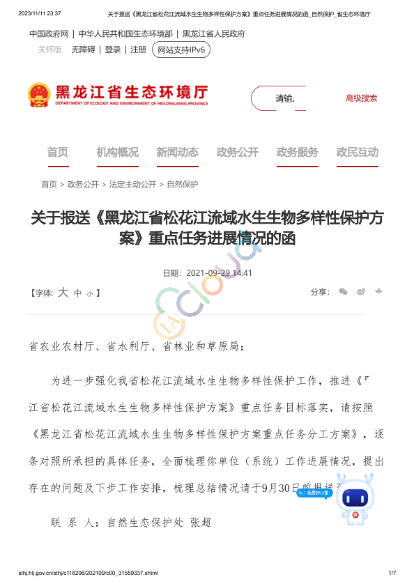 1、关于印发《黑龙江省松花江流域水生生物多样性保护方案重点任务分工方案》的通知