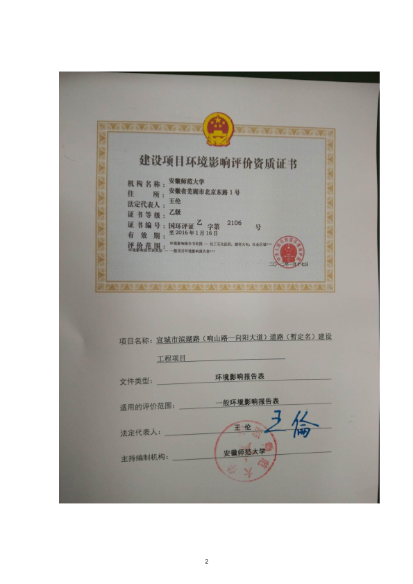 2、《宣城市住房和城乡建设委员会宣城市双溪路、书香路及明慧路道路建设工程项目环境影响报告书(送审稿)》受