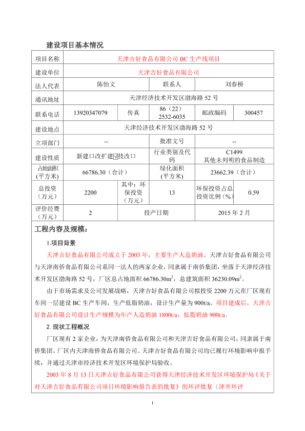 1、天津南侨食品有限公司IC生产线项目环境影响报告表受理情况7329