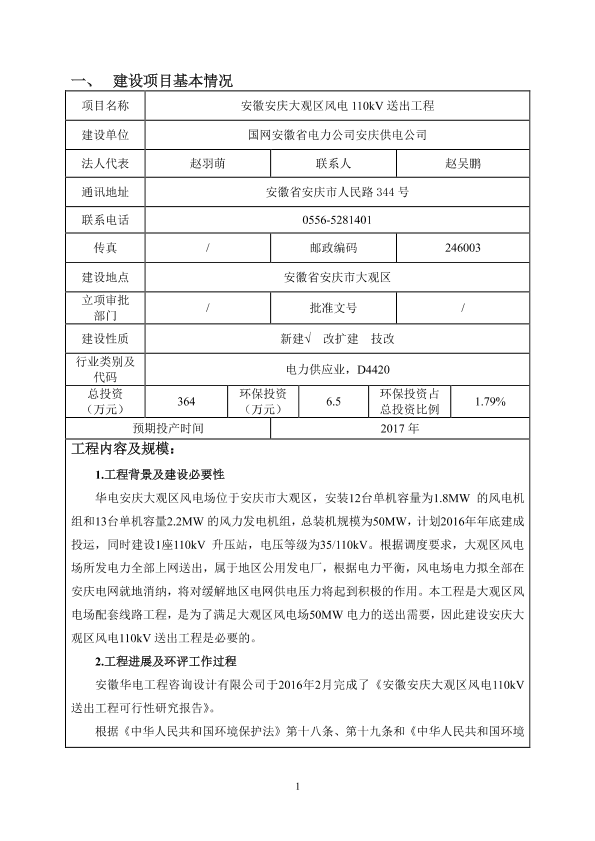 [受理公示]《安庆三500kv变电站220kv送出工程环境影响报告表》、《安庆大观风电场110kv送出工程环境影响报告表》a61030a5427.pdf