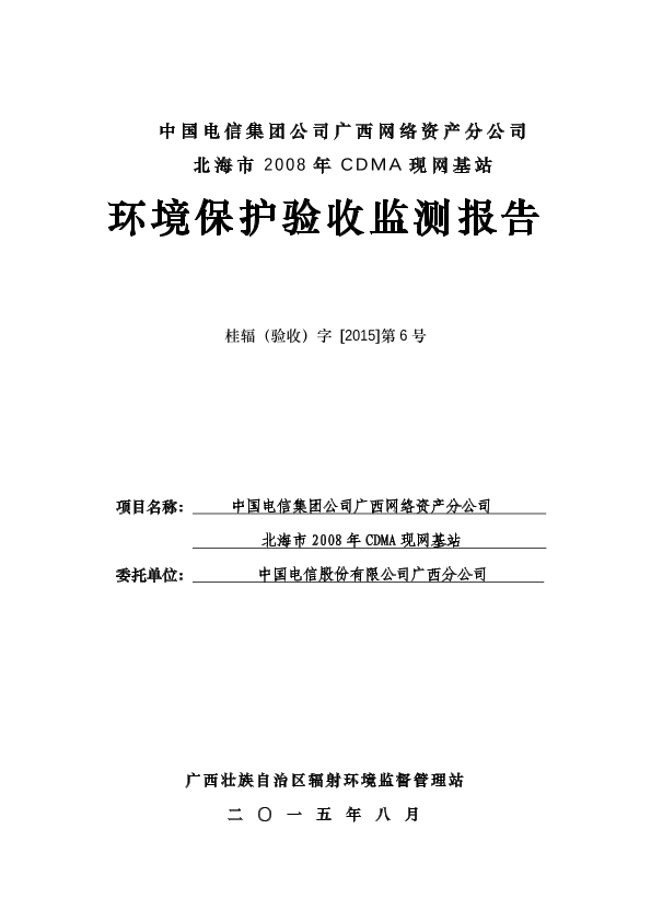 中国电信集团公司广西网络资产分公司北海市2008年cdma现网基站环境保护设施竣工验收审批667034316