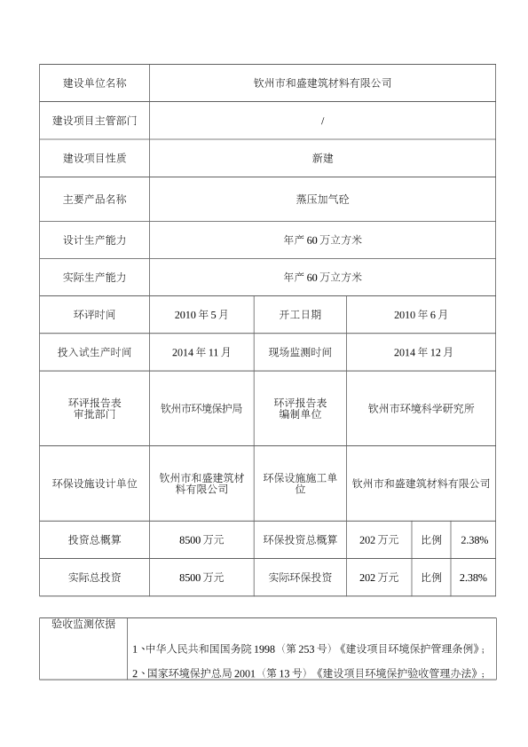 钦州市和盛建筑材料有限公司年产60万立方米蒸压加气砼项目