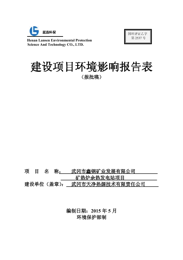 武冈市鑫钢矿业发展有限公司矿热炉余热发电站项目受理情况公开_1173271.pdf