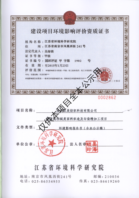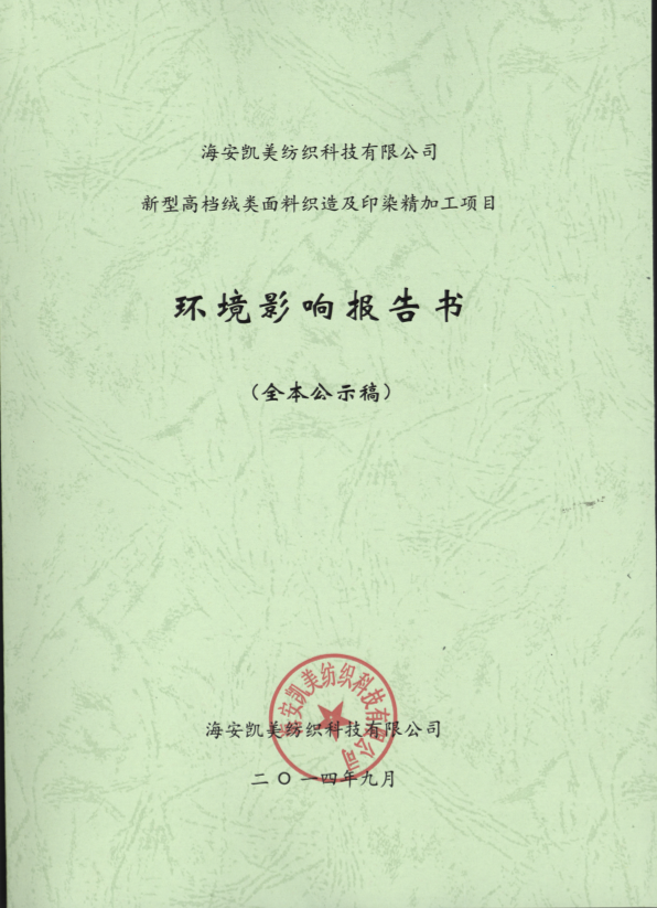 1、海安凯美纺织科技有限公司新型高档绒类面料织造及印染精加工项目环境影响评价全本公示