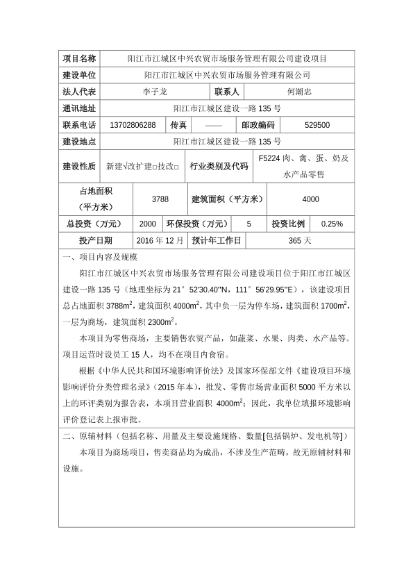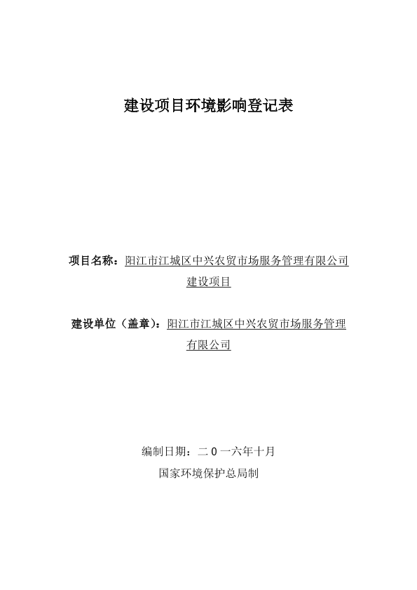 关于阳江市江城区中兴农贸市场服务管理有限公司建设项目登记表的受理公告