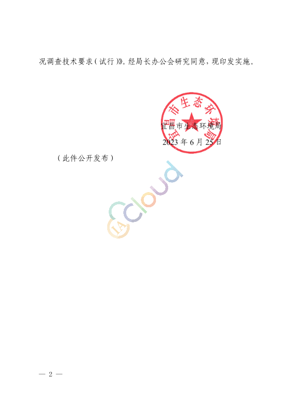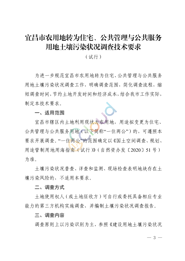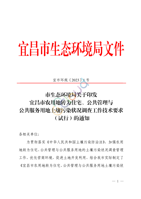 宜市环规〔2023〕1号 市生态环境局关于印发宜昌市农用地转为住宅、公共管理与公共服务用地土壤污染状况调查工作技术要求(试行)的通知 公开