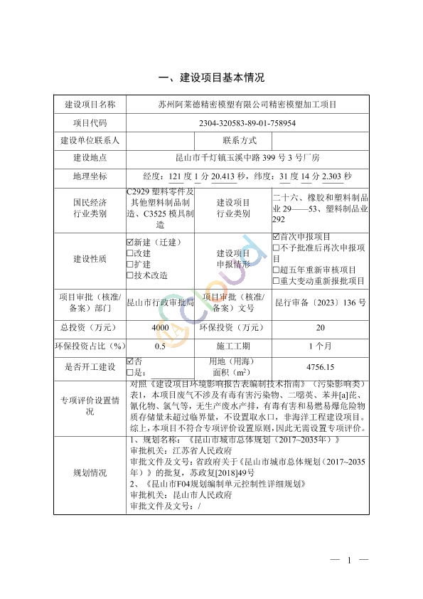 1、苏州市鑫创精密模具有限公司新建模具生产项目环评表