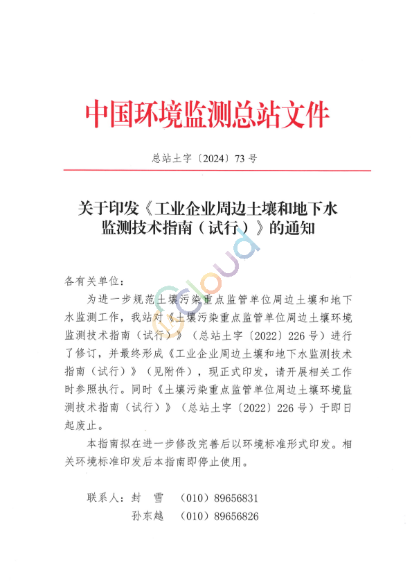 关于印发《工业企业周边土壤和地下水监测技术指南(试行)》的通知 (总站土字〔2024〕73号) 公开