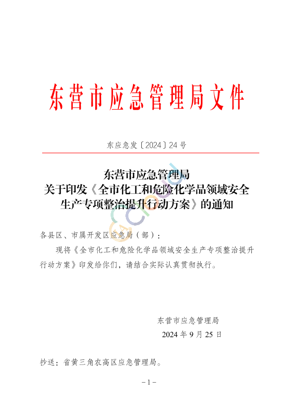 东营市应急管理局关于印发《全市化工和危险化学品领域安全生产专项整治提升行动方案》的通知