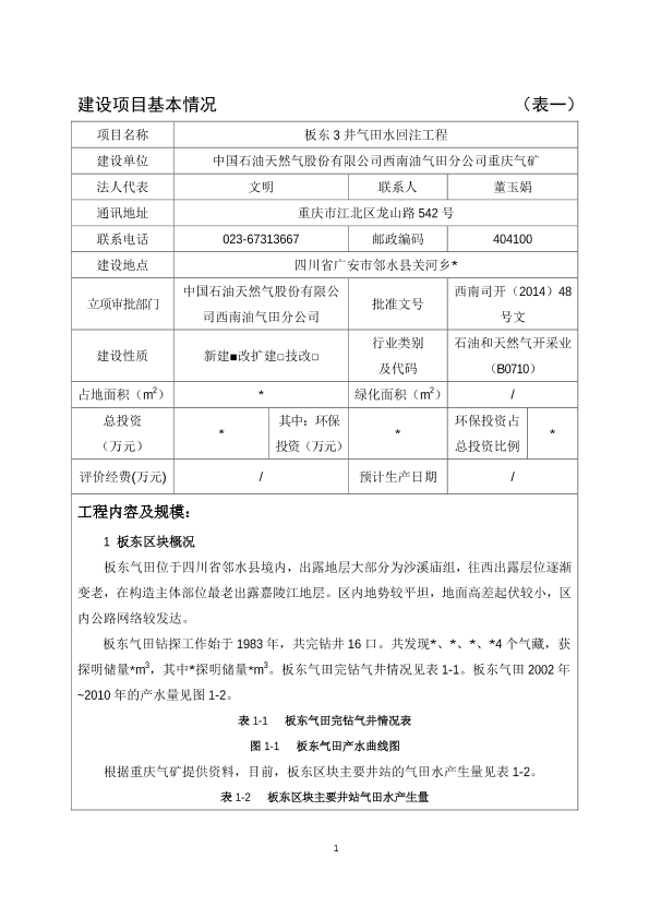 1、中石油天然气西南油气田分公司重庆气矿板东3井气田水回注工程