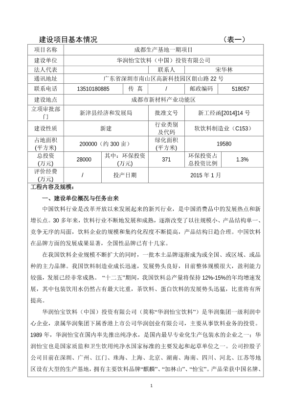 1、华润怡宝饮料(中国)投资有限公司成都生产基地二期饮料生产项目9265