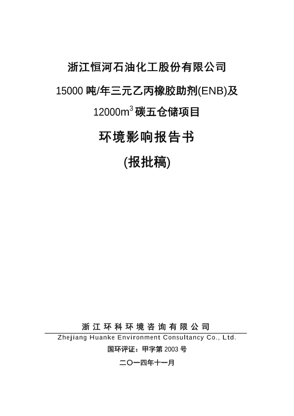 宁波市浙江恒河石油化工股份有限公司15000吨年三元乙丙橡胶助剂(ENB)及12000m3碳五仓储项目6769 公开