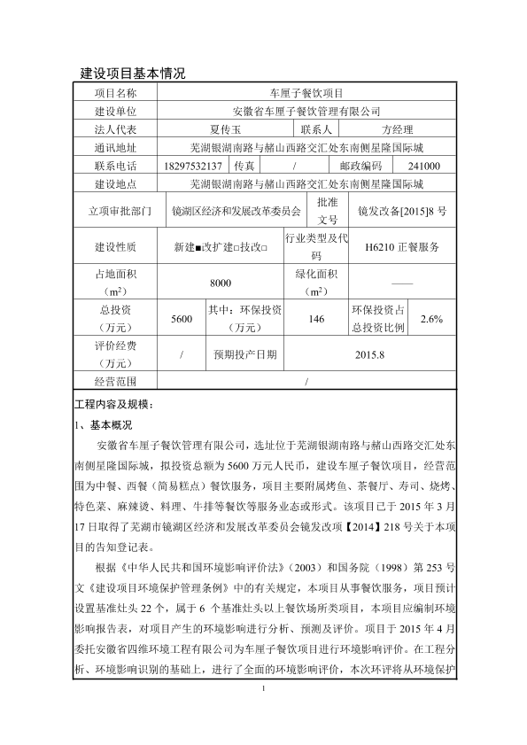 1、芜湖曹一操餐饮管理有限公司曹操餐饮项目环境影响报告表公示