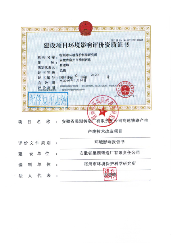 安徽省巢湖铸造厂有限责任公司高速铁路产品生产线技改项目