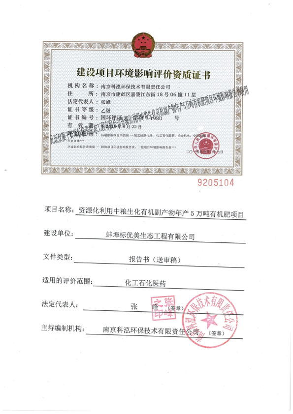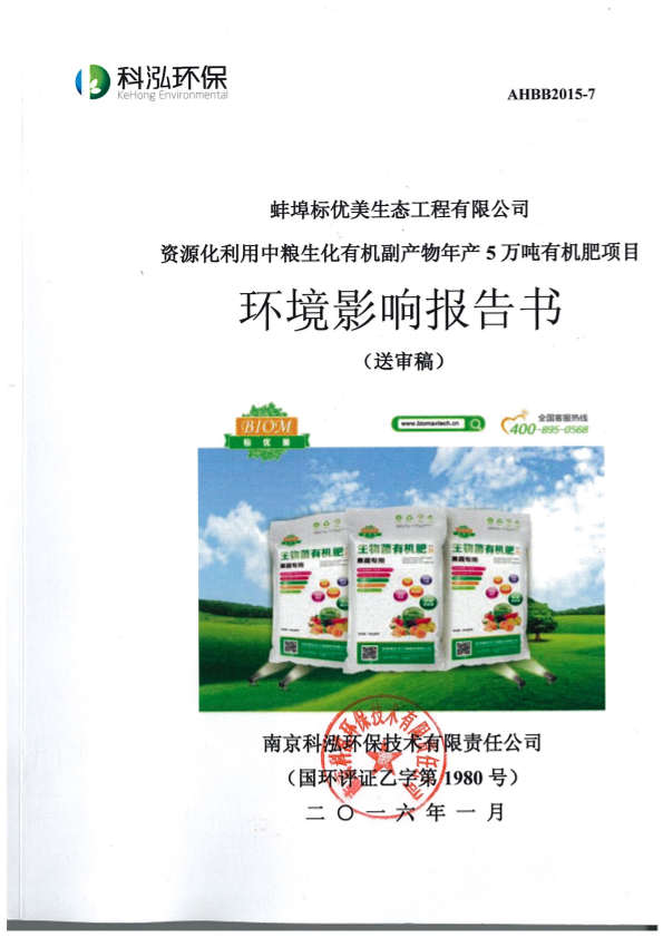 《蚌埠标优美生态工程有限公司资源化利用中粮生化有机副产物年产5万吨有机肥项目环境影响报告书》受理公示a15335a7977