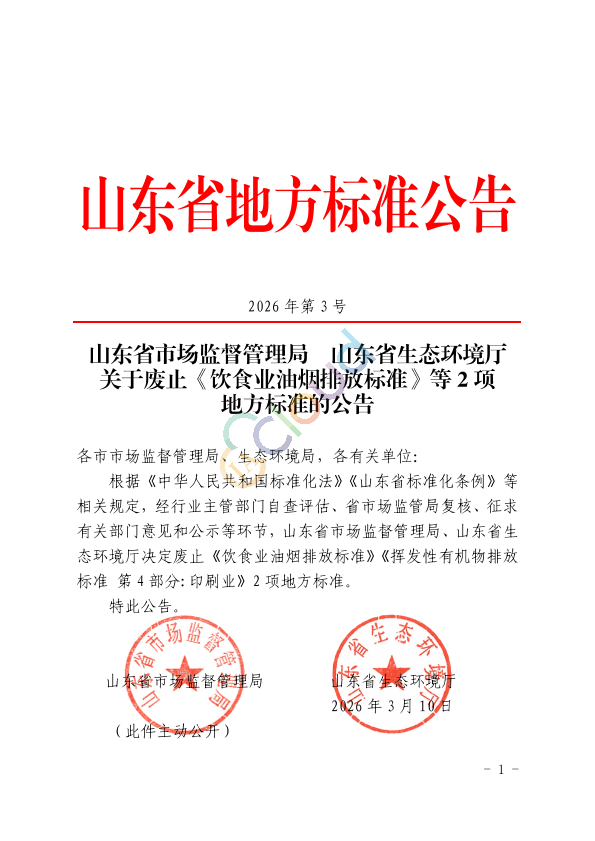 山东省市场监督管理局 山东省生态环境厅 关于废止《饮食业油烟排放标准》等2项地方标准的公告