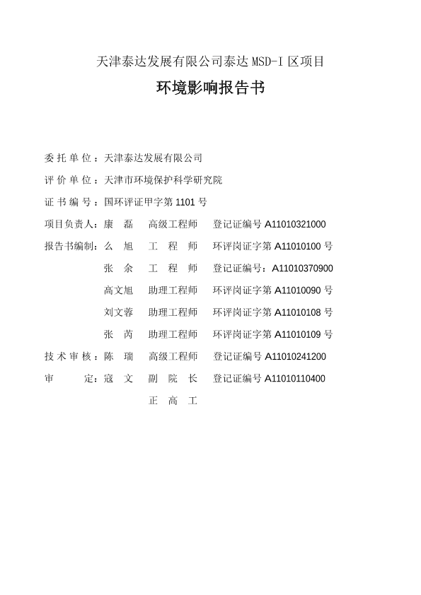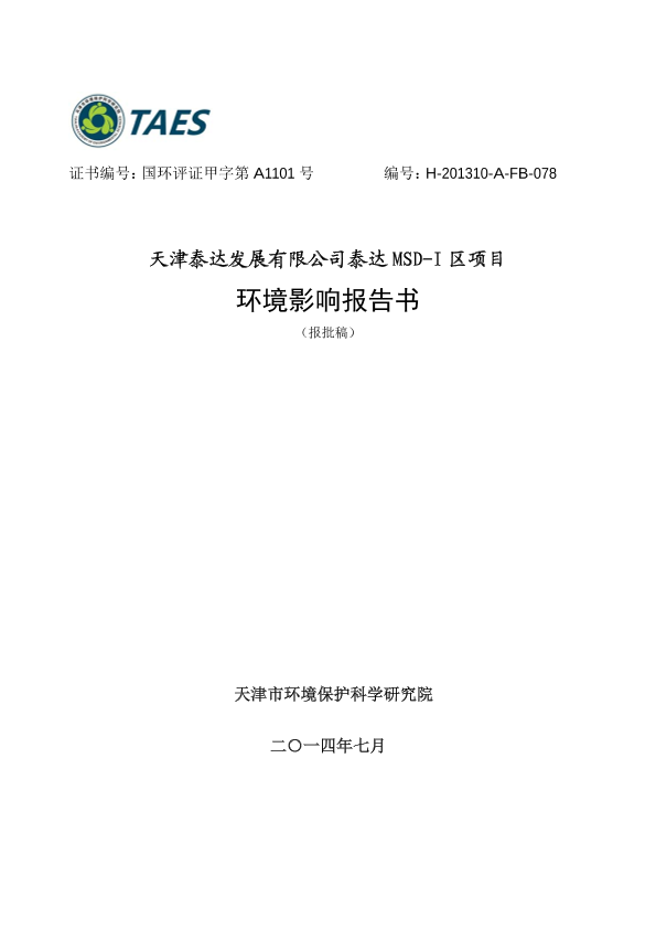 天津泰达发展有限公司泰达MSD-I区项目环境影响报告表受理情况公示-天津经济技术开发区环境保护局1313