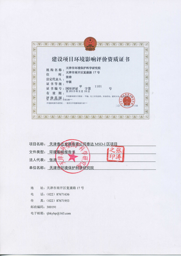 1、天津泰达发展有限公司泰达MSD-B11项目环境影响报告表受理情况公示-天津经济技术开发区环境保护局1313