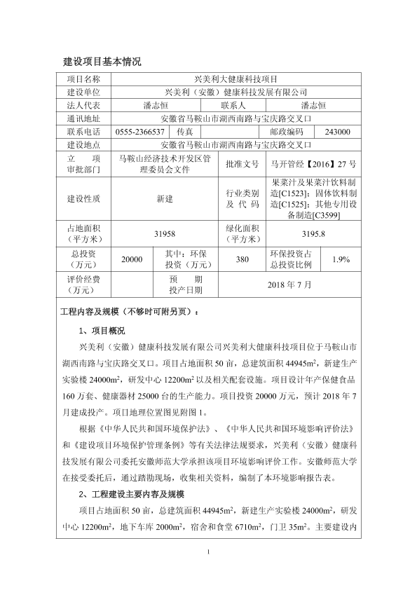 1、《兴美利(安徽)健康科技发展有限公司兴美利大健康科技项目环境影响报告表》审批前公示a60985a5869