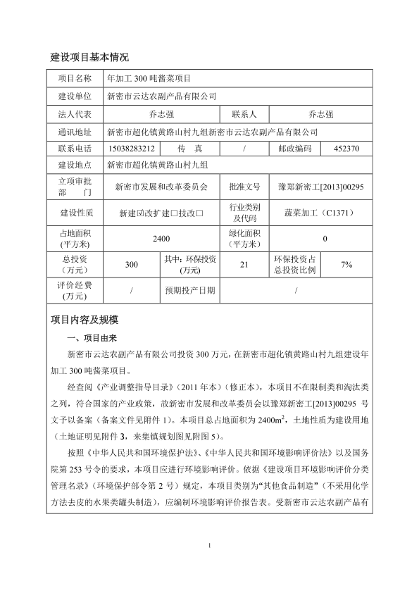 年加工300吨酱菜项目 公开