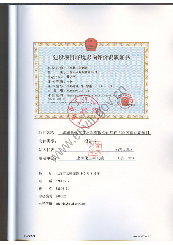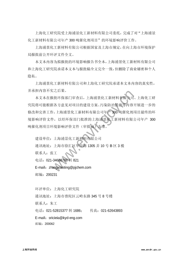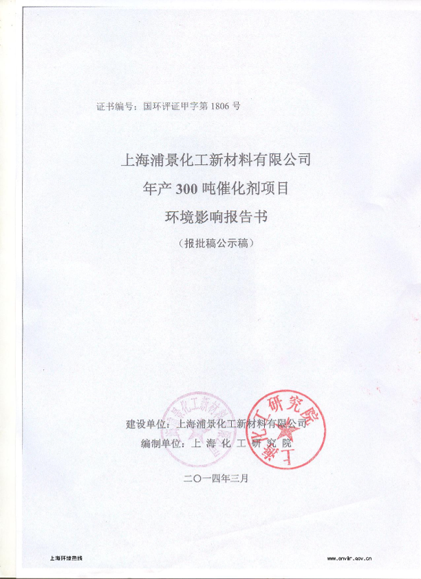 上海浦景化工新材料有限公司年产300吨催化剂项目2522 公开