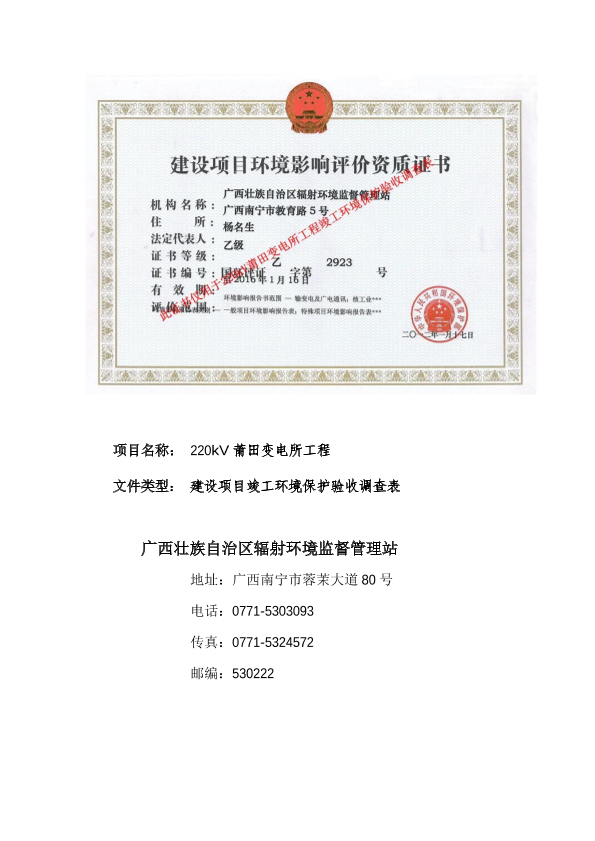 3、广西电网公司220kv莲塘变电站工程环境保护设施竣工验收审批
