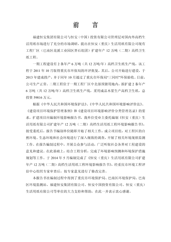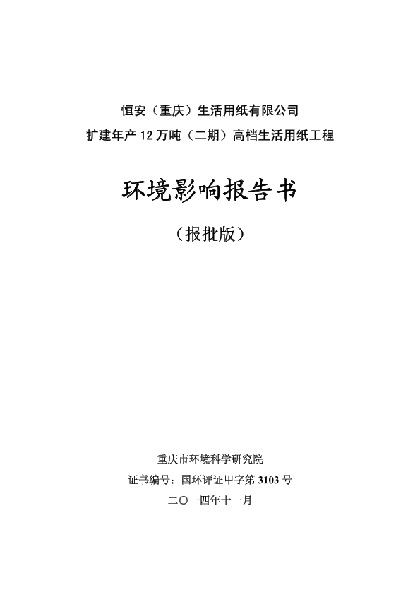 2014-11-28·恒安(重庆)生活用纸有限公司扩建年产12万吨(二期)高档生活用纸工程环境影响报告书8332.pdf