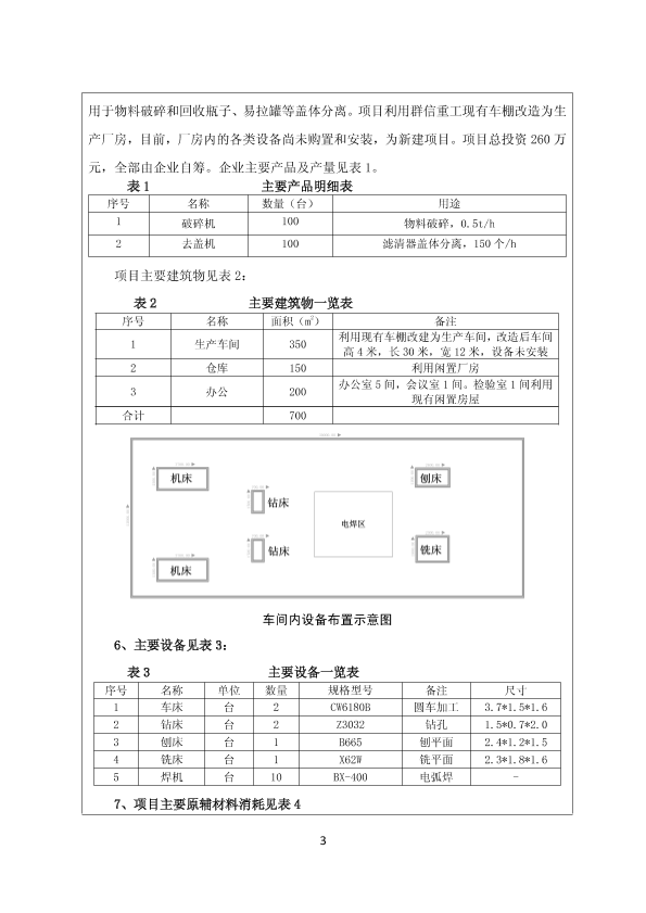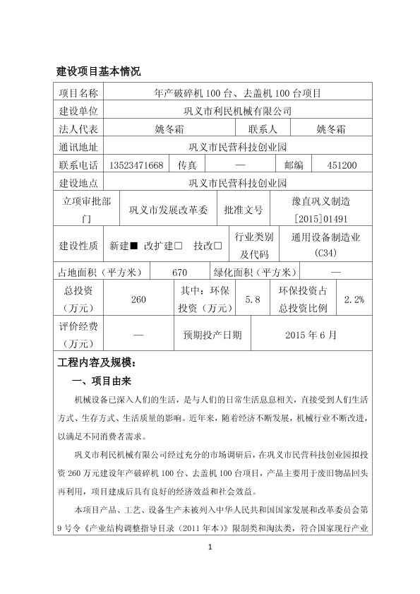 民营科技创业园-年产破碎机100台、去盖机100台项目报告表4097