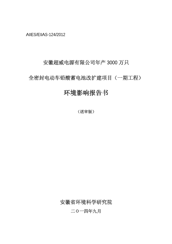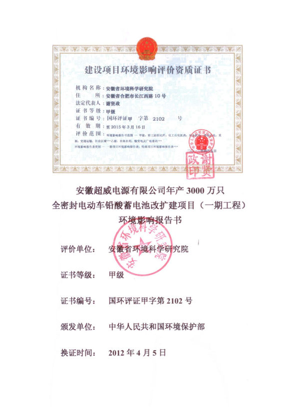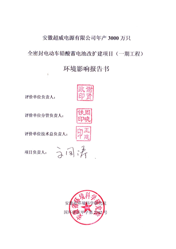 《安徽超威电源有限公司年产3000万只全密封电动车铅酸蓄电池改扩建项目环境影响报告书》受理公示