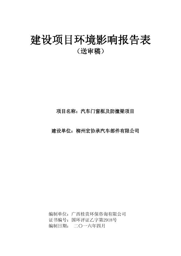 柳州宏协承汽车部件有限公司汽车门窗及防撞梁项目环境影响报告表审批 505874665