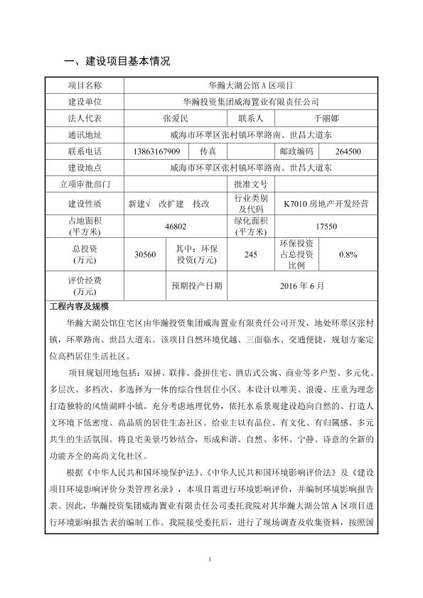 1、威海市环保局环翠分局关于华瀚投资集团威海置业有限责任公司大湖公馆b区建设项目环境影响评价文件受理情况的公示