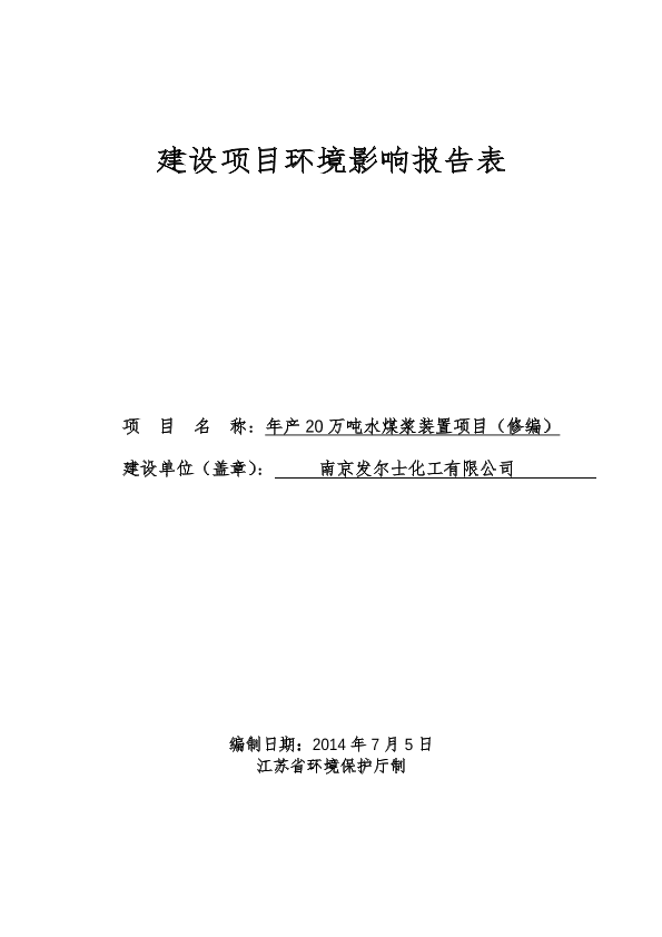 年产 20 万吨水煤浆装置项目(修编)环境影响报告表全本公示 公开