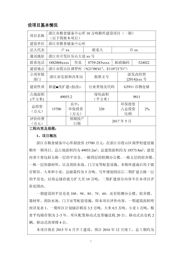 1、湛江市粮食储备中心库湛江市粮食储备中心库10万吨粮库建设项目环境影响报告表受理公告