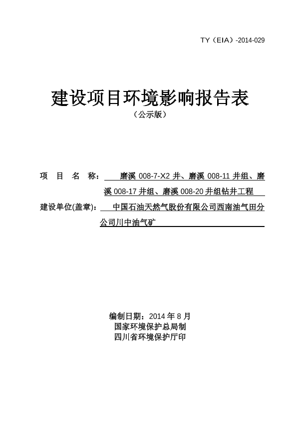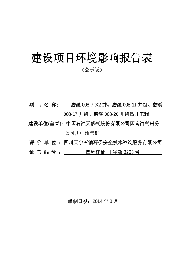 中石油天然气西南油气田分公司川中油气矿磨溪008-7-x2井、008-11井组、008-17井组、008-20井组钻井工程