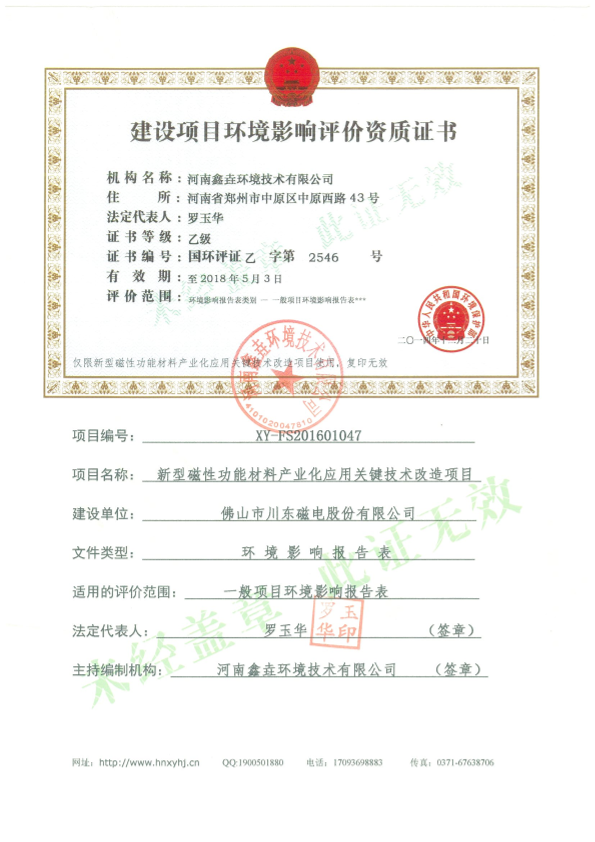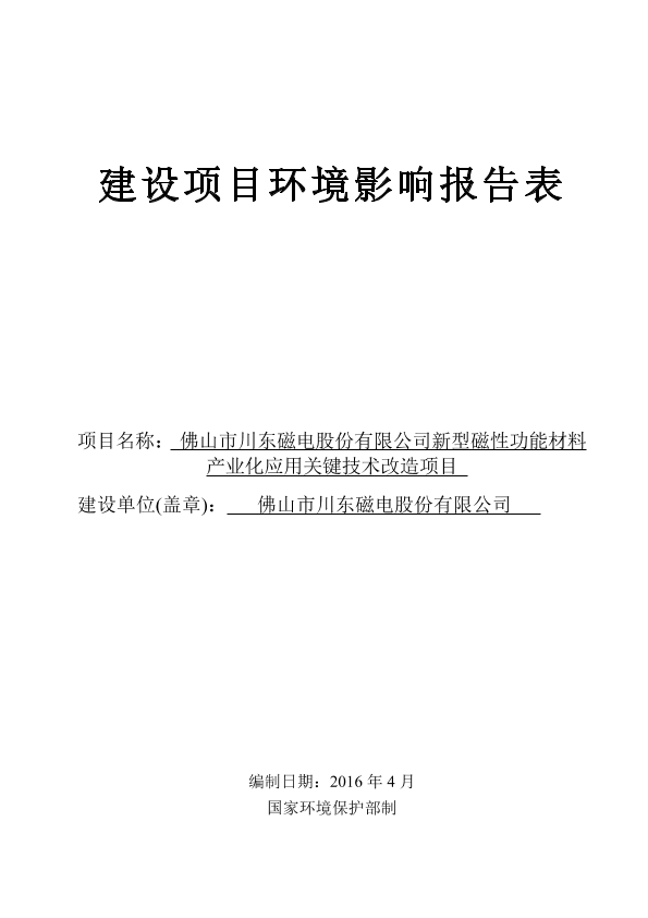 佛山市川东磁电股份有限公司新型磁性功能材料产业化应用关键技术改造项目环境影响报告表 公开