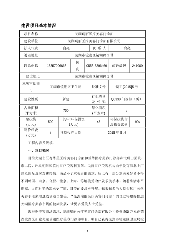 1、芜湖爱容医疗美容门诊部 爱容医疗美容门诊部环境影响报告表公示
