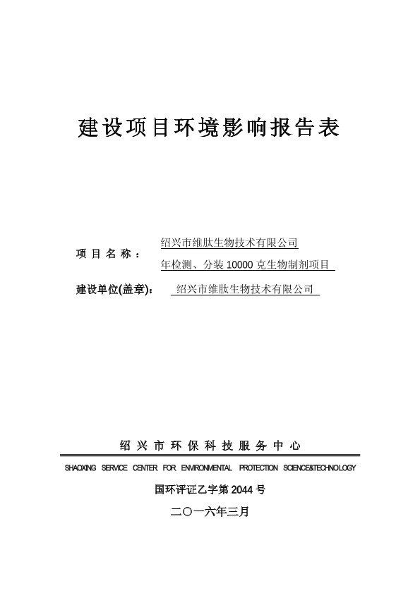 绍兴市维肽生物技术有限公司年检测、分装10000克生物制剂项目916493670