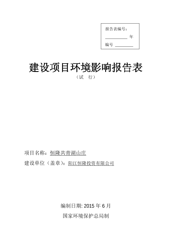 关于阳江恒隆投资有限公司恒隆共青湖山庄建设项目环境影响报告表的受理公告