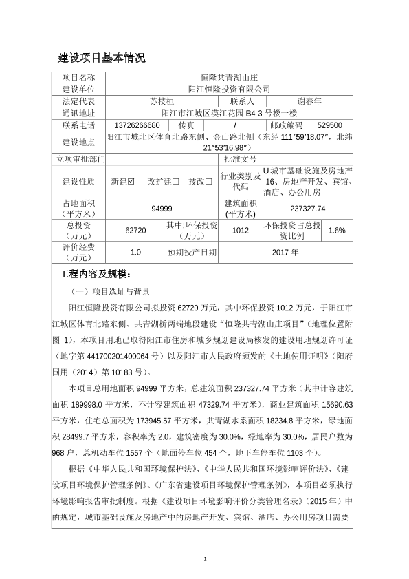 关于阳江恒隆投资有限公司恒隆共青湖山庄建设项目环境影响报告表的受理公告_2612.pdf