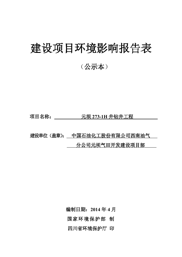 中国石油化工股份有限公司西南油气田分公司元坝气田开发建设项目元坝102-3h井、元坝102-1h井、元坝205-2井、元坝204-2井、元坝273-2h、元坝273-1h井钻井工程_32510.pdf