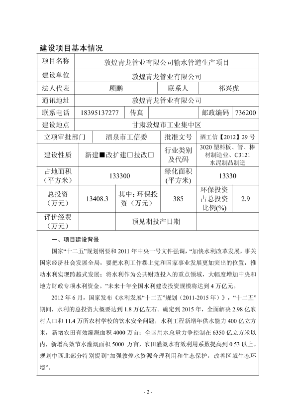 敦煌青龙管业有限公司输水管道生产项目(公示)3420