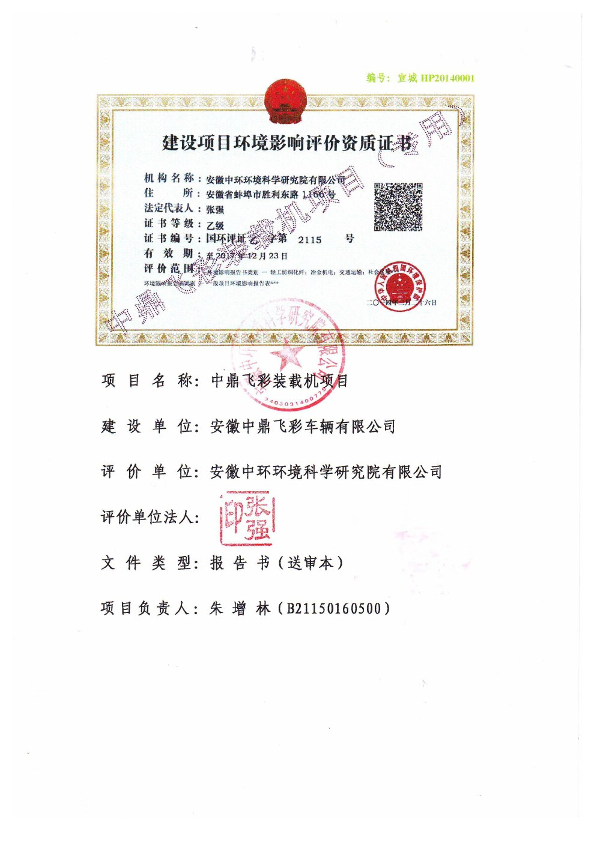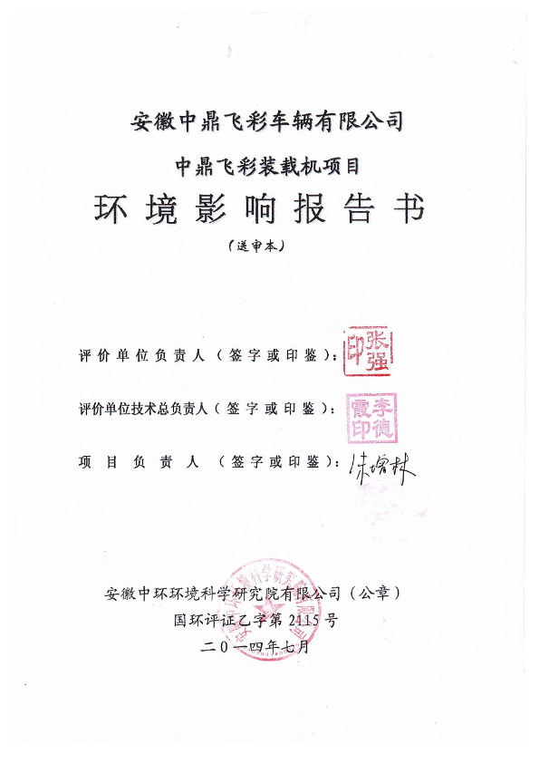 1、《安徽联合飞彩车辆有限公司年产2000辆特种专用车项目环境影响报告书(送审稿)》受理公示