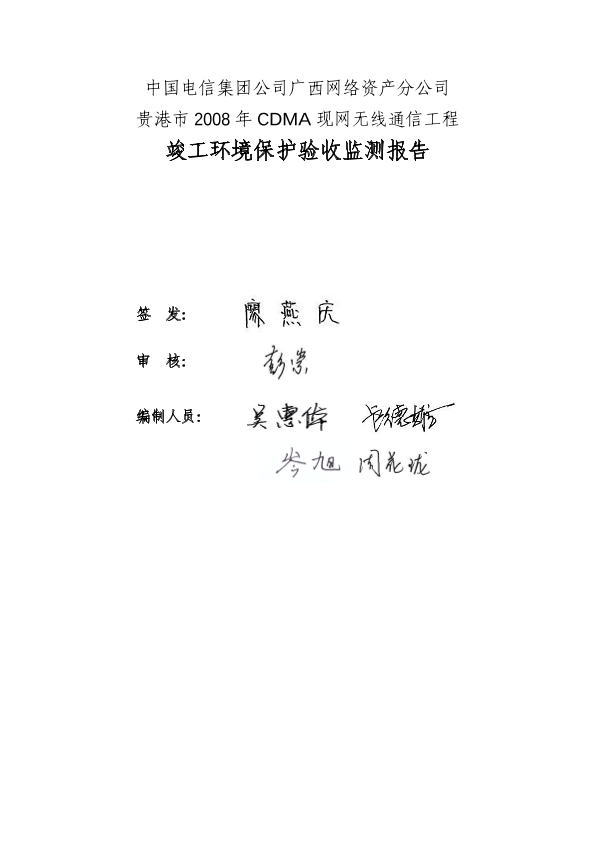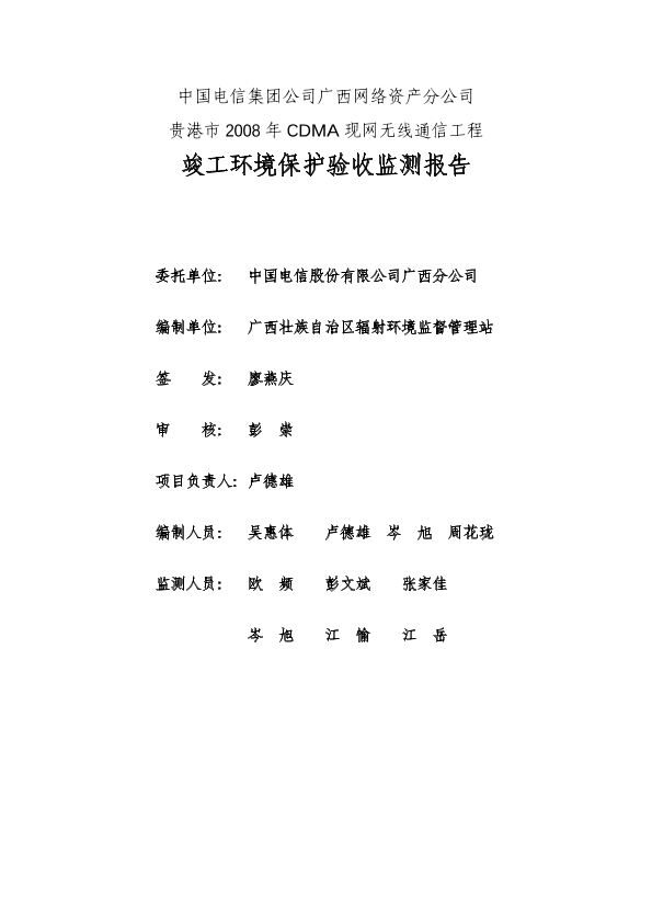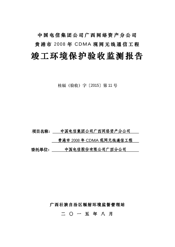 中国电信集团公司广西网络资产分公司贵港市2008年cdma现网无线通信工程环境保护设施竣工验收审批153584600
