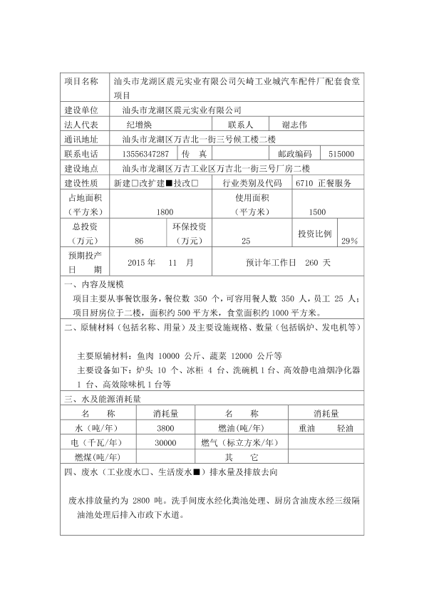汕头市龙湖区震元实业有限公司矢崎工业城汽车配件厂配套食堂项目环境影响登记表pdf