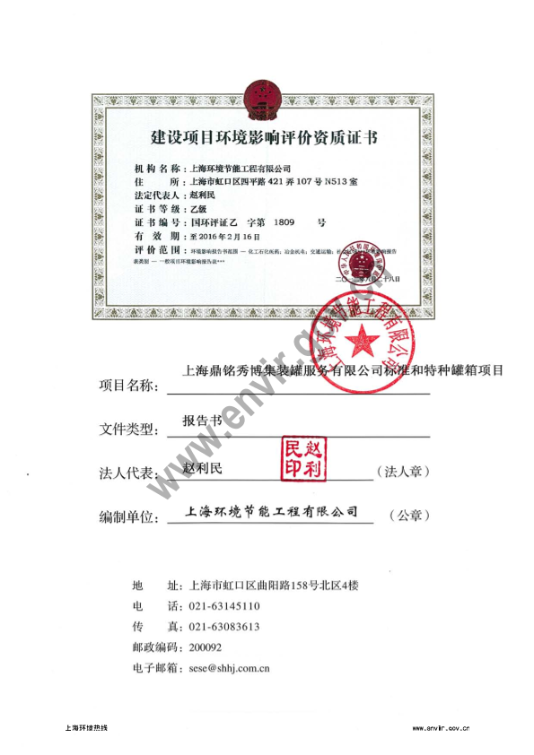 上海鼎铭秀博集装罐服务有限公司标准和特种罐箱项目环境影响评价报批前公示9204