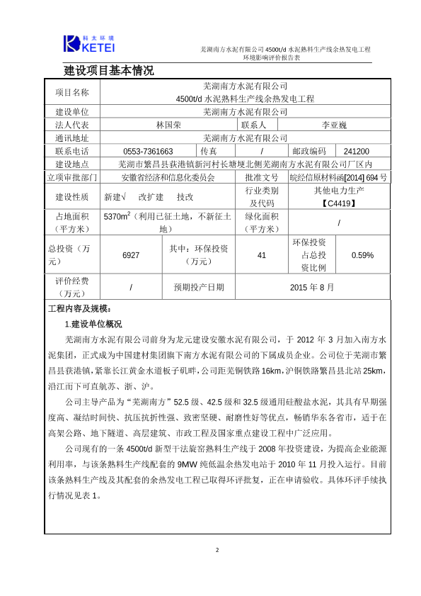 芜湖南方水泥有限公司 4500td 水泥熟料生产线余热发电工程环境影响评价报告表公示a79357a8095