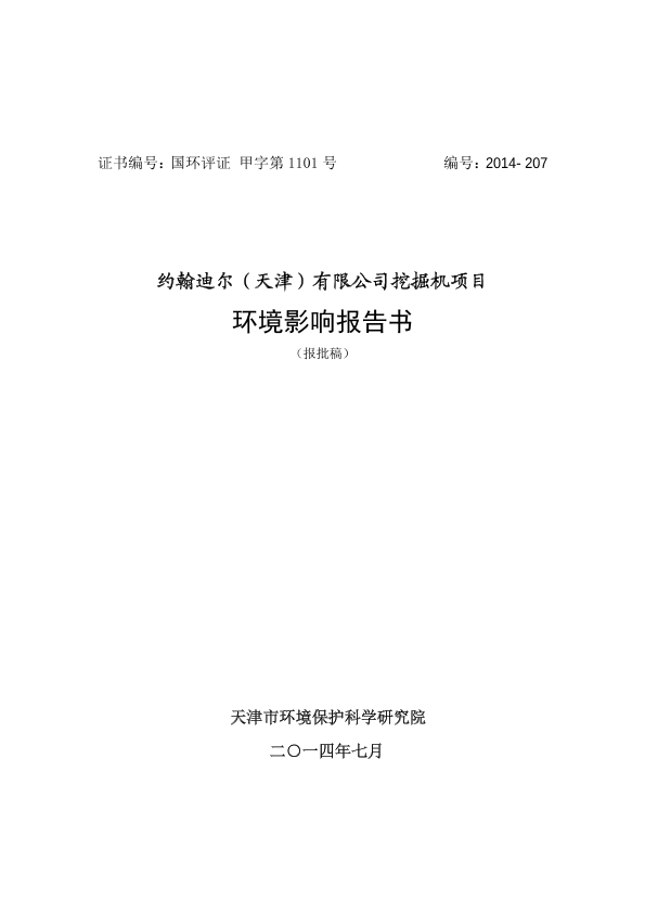 约翰迪尔(天津)有限公司挖掘机项目环境影响报告书受理情况公示-天津经济技术开发区环境保护局8878
