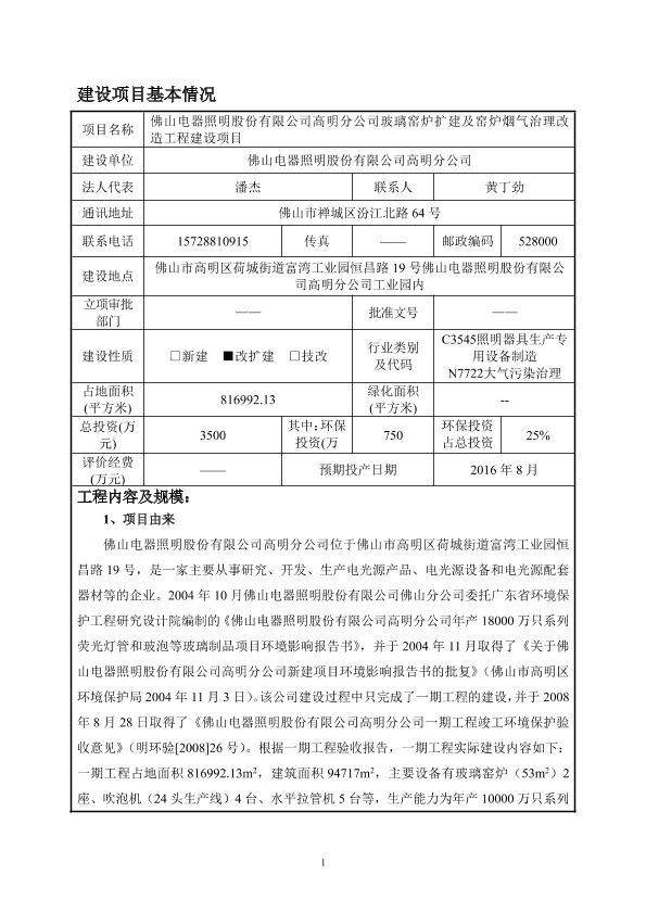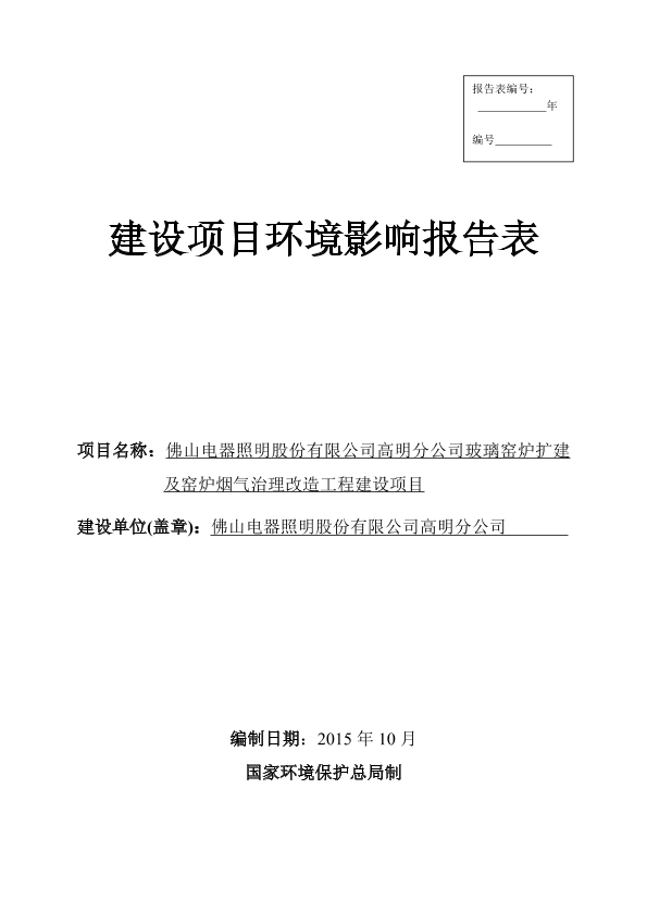 佛山电器照明股份有限公司高明分公司玻璃窑炉扩建及窑炉烟气治理改造工程建设项目环境影响报告表